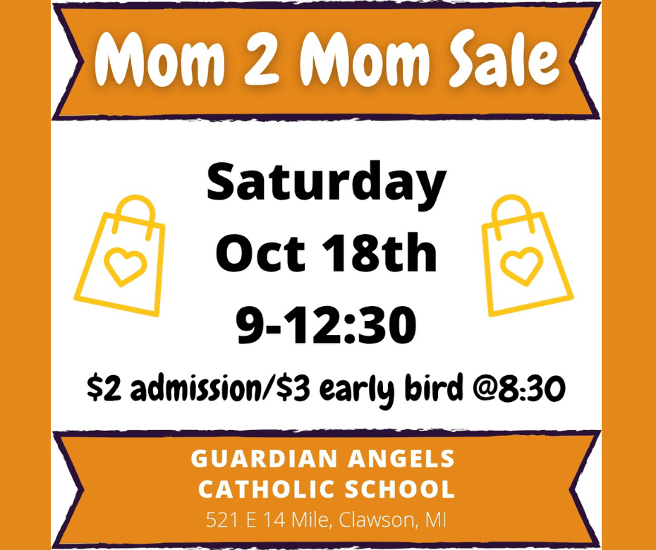 Join us for our Fall Mom2Mom Sale at Guardian Angels Catholic School in Clawson, MI on Saturday, October 18 from 8:30am-12:30pm. Early bird admission from 8:30am-9:00am is $3. Regular admission after 9:00am is $2.